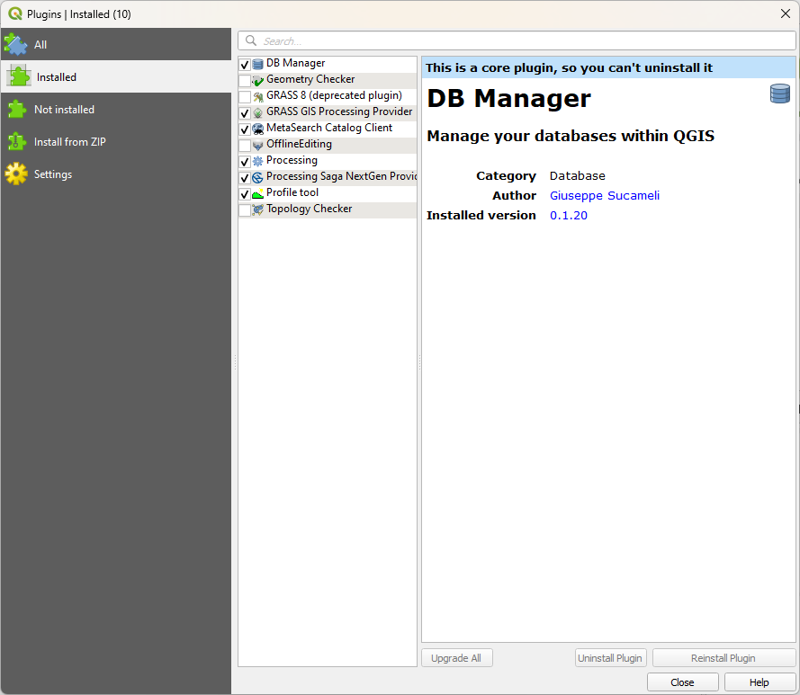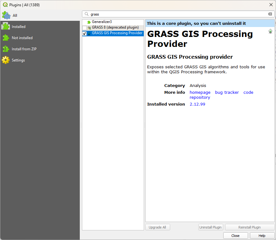 plugins by checking (or unchecking) the box next to each one. We can see here that both SAGA and GRASS processing