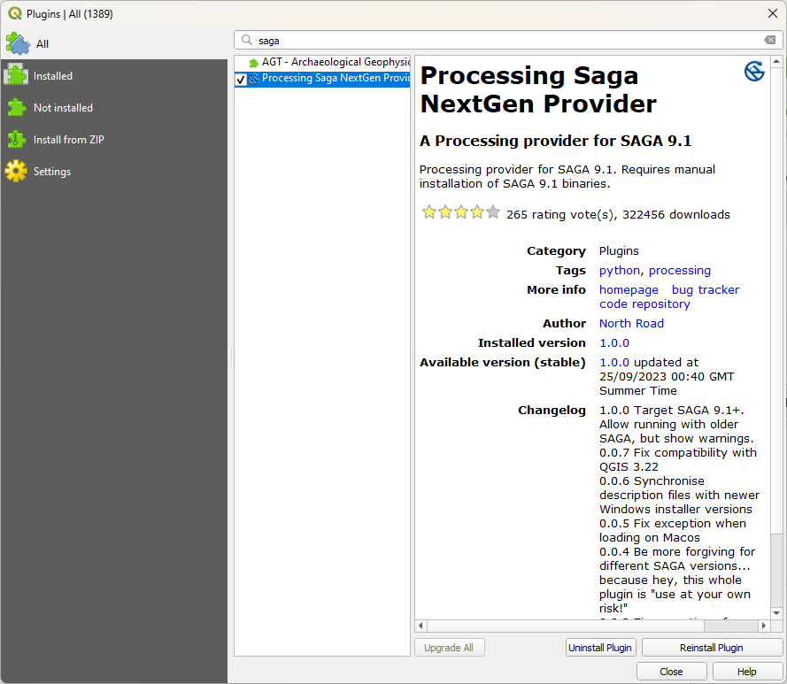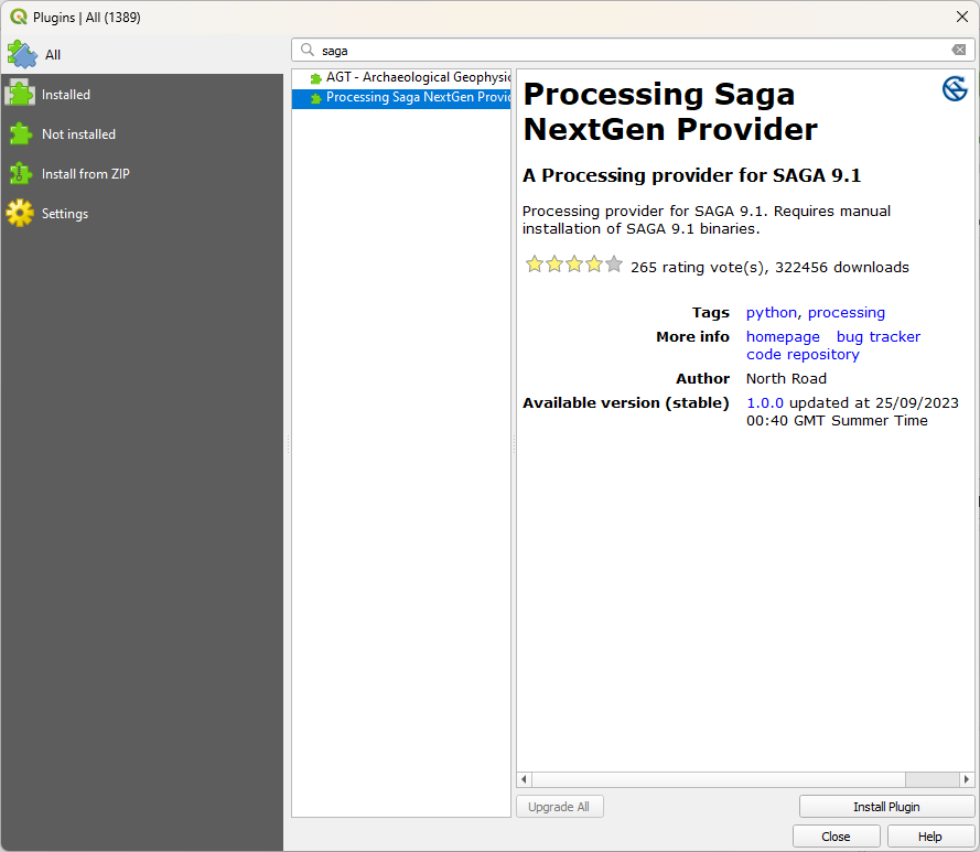To install the SAGA plugin, type “saga” into the search bar at the top of the window. You should see two options - make sure to select Processing Saga NextGen Provider:
