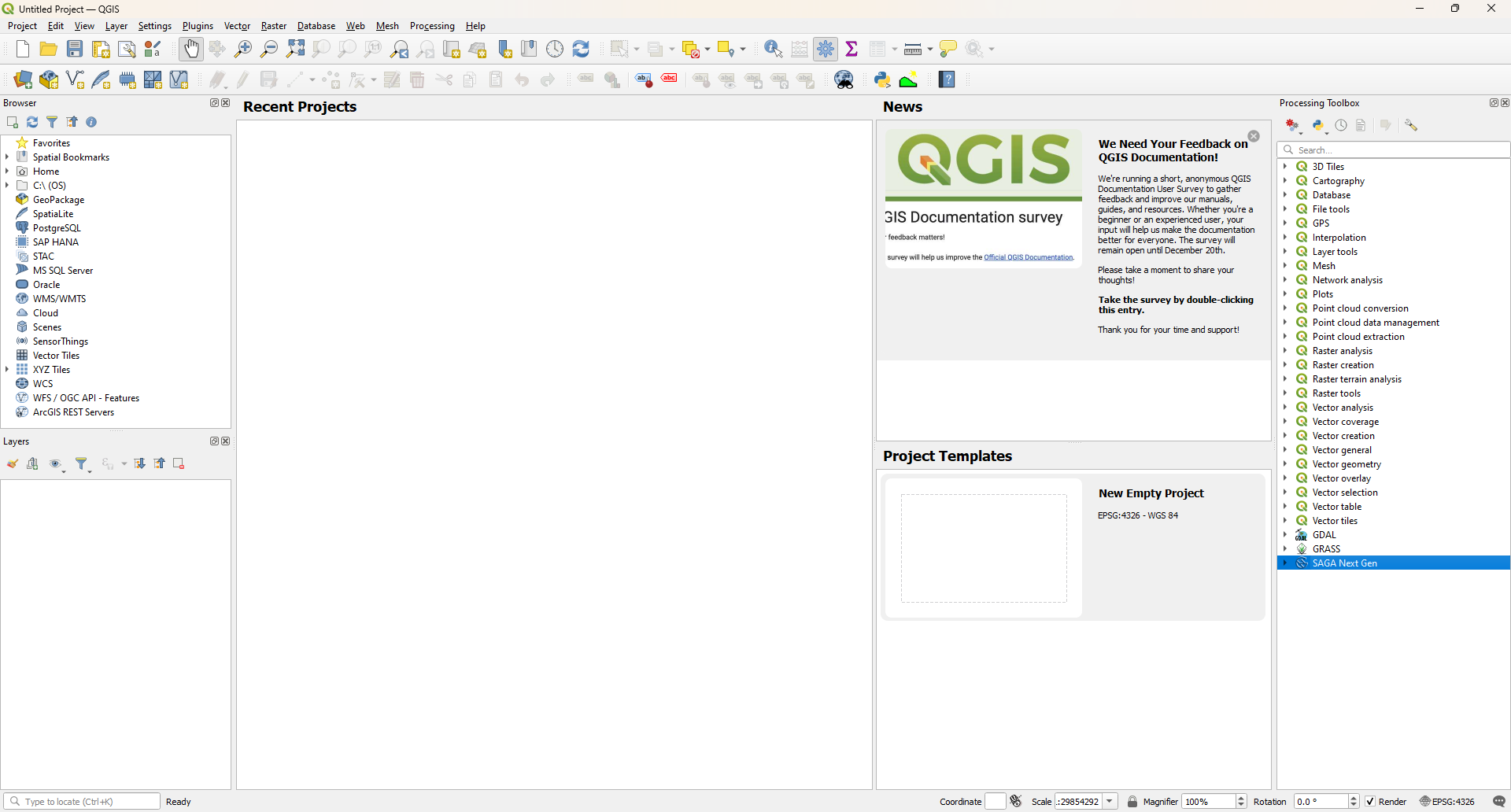 To access the functions provided by SAGA, GRASS (and other) plugins, you can open the Processing toolbox (Processing > Toolbox), which will open as a panel on the right side of the window: